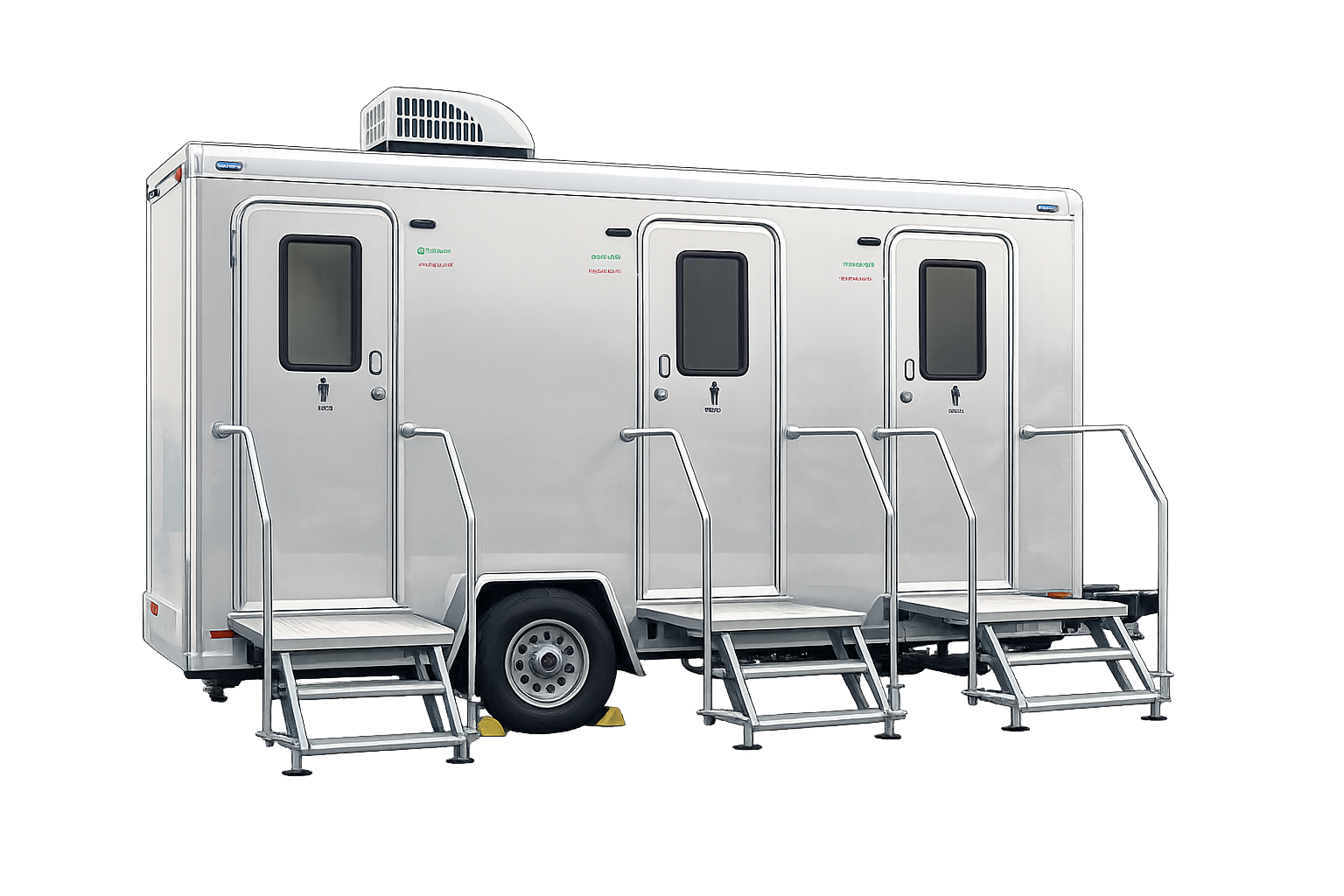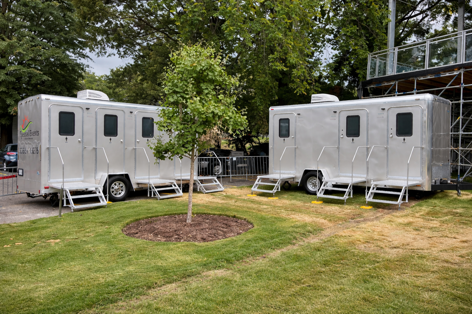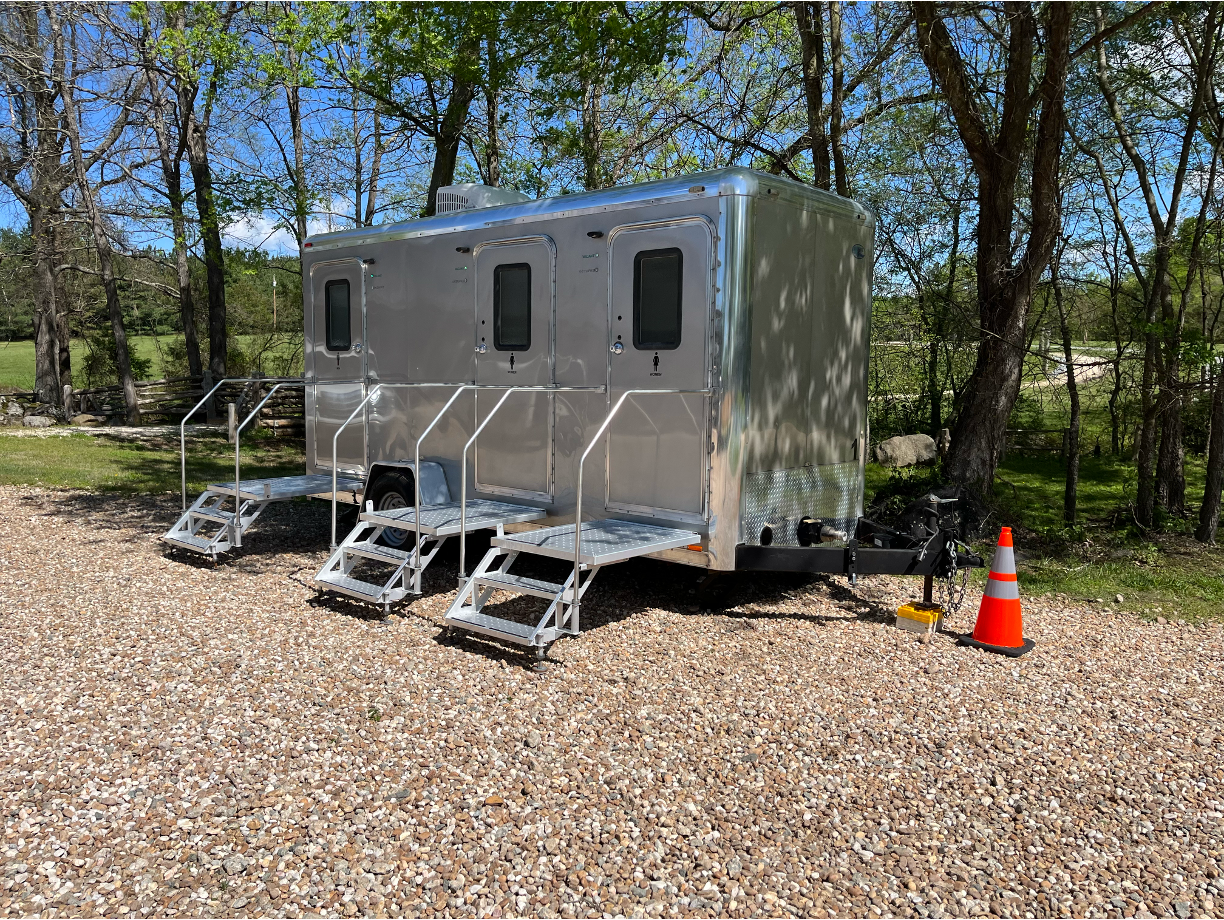 Designed for remote locations, these units are generator-compatible and equipped with an onboard water tank to comfortably support events of up to 350 guests.